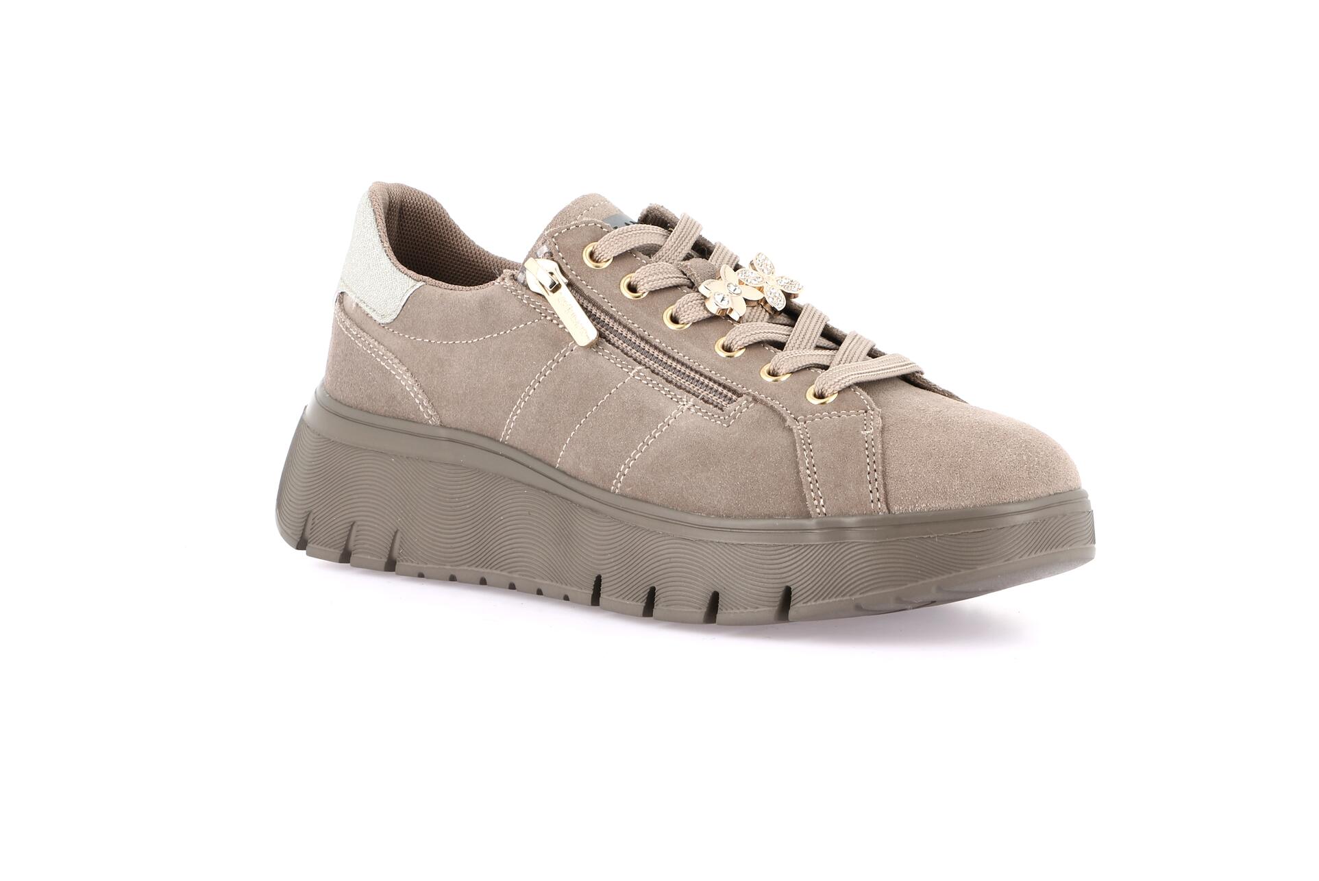 Besonders weiches Obermaterial aus Veloursleder, ergänzt durch einen seitlichen Reißverschluss und funkelnde Anhänger an den Schnürsenkeln. Komfort wird durch die Re-Soft-Einlegesohle garantiert, die den Auftritt abfedert, sowie durch die Conforma-Sohle, die dem Fuß natürliche Bewegungsfreiheit ermöglicht.