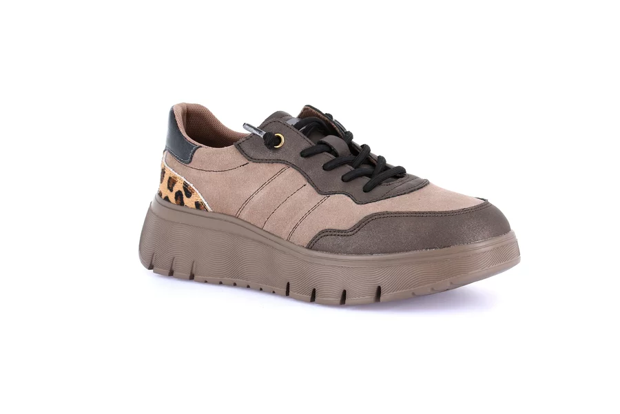Ein Sneaker, der die Regeln bricht. Am Obermaterial verschmelzen Animal-Print-Einsätze und Taupe-Nuancen zu einem mutigen, aber harmonischen Design. Komfort wird durch die Re-Soft-Einlegesohle garantiert, die den Auftritt abfedert, sowie durch die Conforma-Sohle, die dem Fuß natürliche Bewegungsfreiheit ermöglicht.