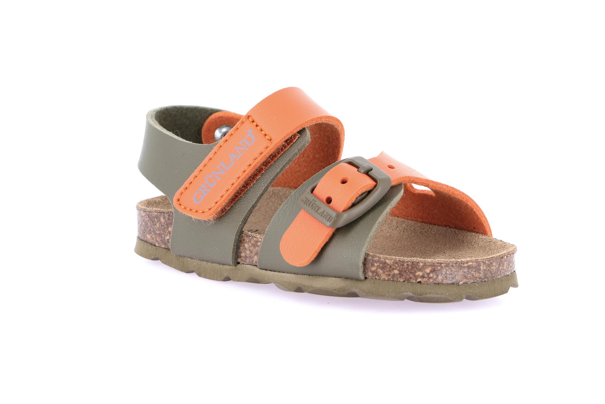Sandalo primi passi con fasce a chiusure alternate. La chiusura a strappo e la fibbia permettono la giusta regolazione e aderenza del sandaletto al piede e il plantare in sughero mantiene piedi freschi ed asciutti per tutto il giorno. Realizziamo questo sandalo utilizzando uno speciale materiale riciclato, resistente e amico del pianeta.
