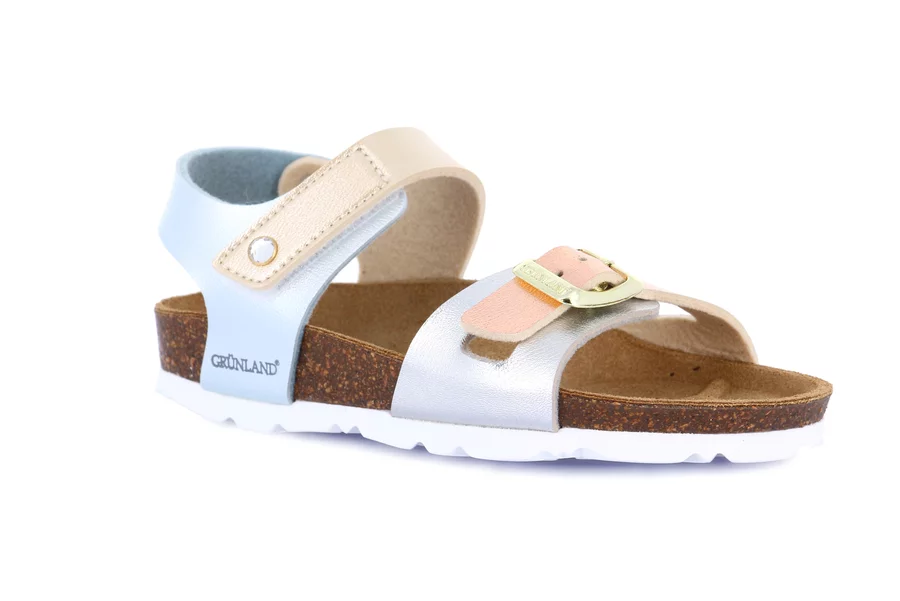 Elegante e raffinato sandaletto, perfetto per l'estate della tua bimba. Grazie al sottopiede anatomico in sughero i suoi piedi sono liberi di respirare.